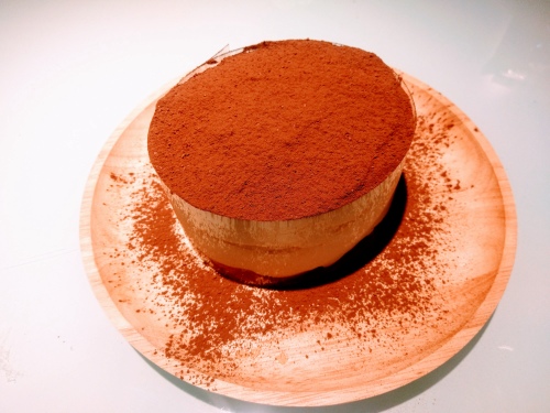 5.以浸過咖啡液的蛋捲當做基底,緩緩倒入cheese內餡。 放置冰箱冷藏一晚