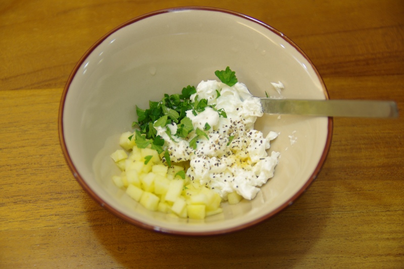 4.把拌勻的香料蘋果丁希臘優格抹在喜年來小蛋餘上,再拿另一片小蛋餅蓋上。